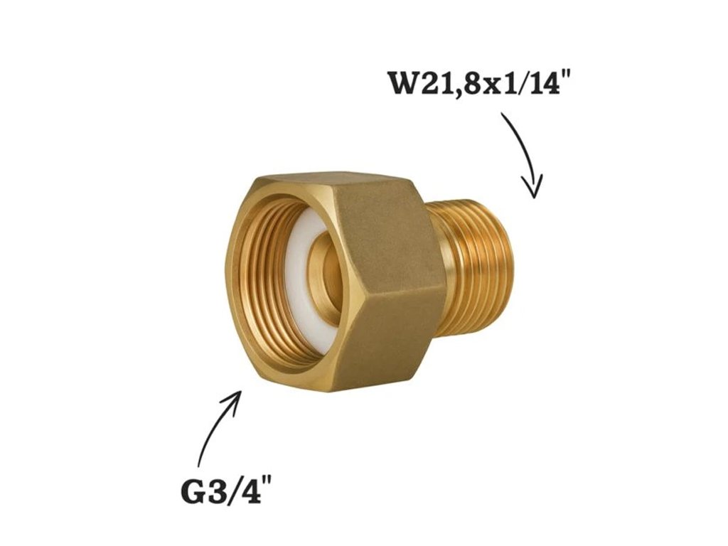 Závitová přechodka určená k připojení redukčního ventilu s převlečnou maticí W 21,8 x 1/14" (argon, směsný plyn) na tlakovou lahev se závitem G 3/4" (CO2).