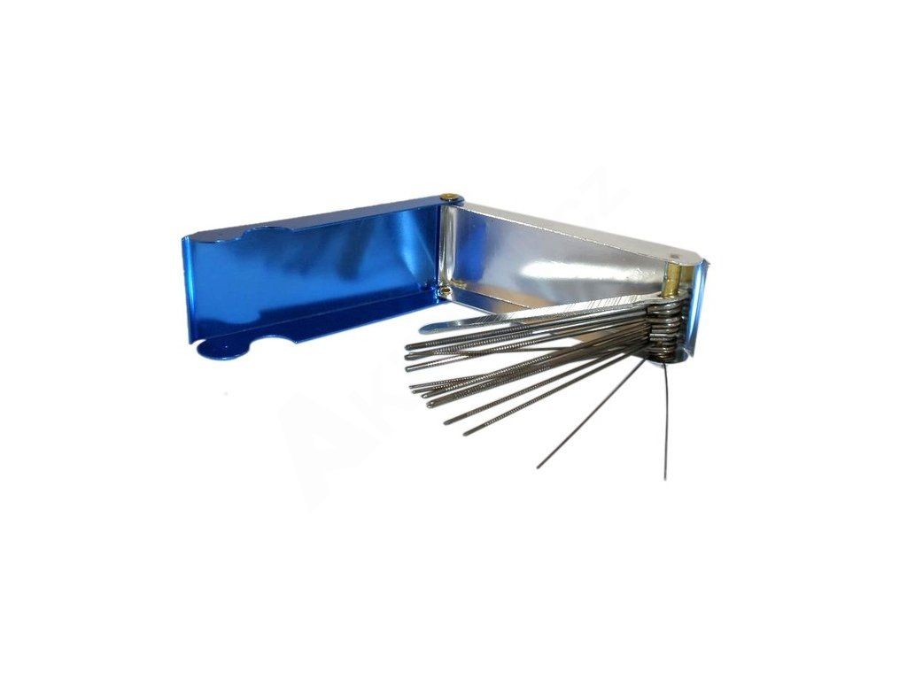 Univerzální sada pro čištění trysek plynových hořáků v plechovém pouzdru.